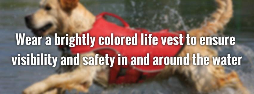If you determine the water is safe, Princess should wear a brightly colored life vest to ensure visibility and safety in and around the water. Even great swimmers could be impaired by an injury or exhaustion, so all dogs should have flotation. The vest should be comfortable, easy to adjust, and have a lift handle to help her out of the water if necessary.
