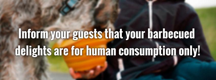 Inform your guests that your barbecued delights are for human consumption only! Greasy human food can cause vomiting, diarrhea, and abdominal pain from pancreatitis or gastroenteritis. Corn cobs, bones and pitted fruits can block the GI tract, leading to obstruction and ending with surgery. Also, avoid toxic foods like onions, garlic, grapes and raisins. You can put out a bowl of dog friendly snacks if you are worried that Uncle Joe will have trouble refraining from sharing.